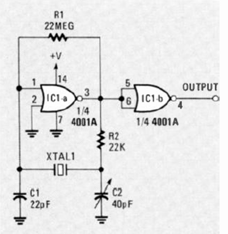 Esta es otra configuración de oscilador de cristal con el 4001. Muchos de ellos están en el sitio web. Esto se encontró en la revista Radio Electronics de enero de 1987.