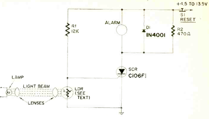 Esta sensible alarma de paso se encontró en la revista Radio Electronics de agosto de 1971. El haz de luz puede obtenerse mediante LED o láser en una versión moderna.