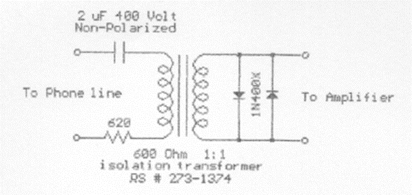 Recomendado para líneas analógicas, esta es la forma de acoplar un teléfono a un amplificador o grabador. El circuito es de documentación de los años 90. El transformador es del tipo aislamiento con relación de vueltas 1:1.