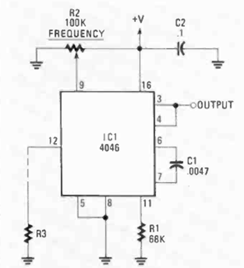Esta es la configuración básica de un oscilador controlado por tensión que utiliza el PLL 4046. El circuito se encontró en la revista Radio Electronics de enero de 1987.