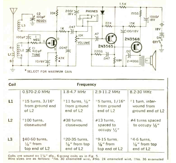 Encontramos este receptor de 3 transistores en la revista Radio Electronics de julio de 1970. Los transistores pueden ser equivalentes actuales. Observe la polaridad de la fuente de alimentación ya que los transistores NPN se diseñaron invertidos. Las bobinas están de acuerdo con las bandas sintonizadas.
