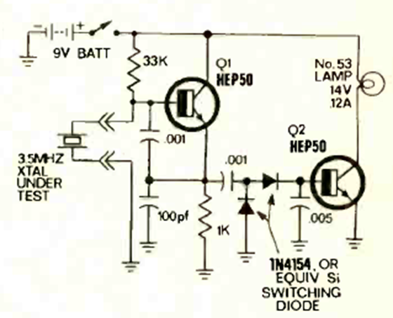 Este circuito fue pensado originalmente para probar cristales utilizados en televisores en color, pero es adecuado para cualquier cristal de hasta 20 o 30 MHz. El circuito es de una revista de Radio Electronics de diciembre de 1971.