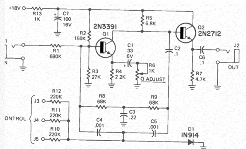 Recomendado para señales de audio en música electrónica, este circuito apareció en la revista Radio Electronics en septiembre de 1973. Los transistores eran un tipo de propósito general en ese momento.