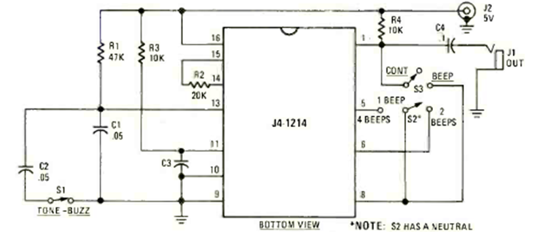 Este circuito de sonido programable fue encontrado en la revista Radio Electronics de julio de 1978. Hace uso de un circuito integrado de la época dedicada a producir efectos.