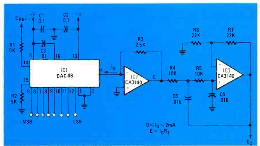 Utilizando un DAC038, este circuito es de Radio Electronics de mayo de 1983. El circuito debe alimentarse con una fuente de 5 V y utiliza salidas com operacionales comunes.