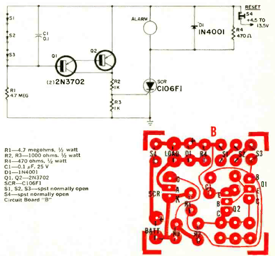 La corriente de reposo de esta alarma es del orden de microamperios y de igual forma la corriente en los sensores. El circuito es de un artículo que encontramos en la revista Radio Electronics de mayo de 1971.