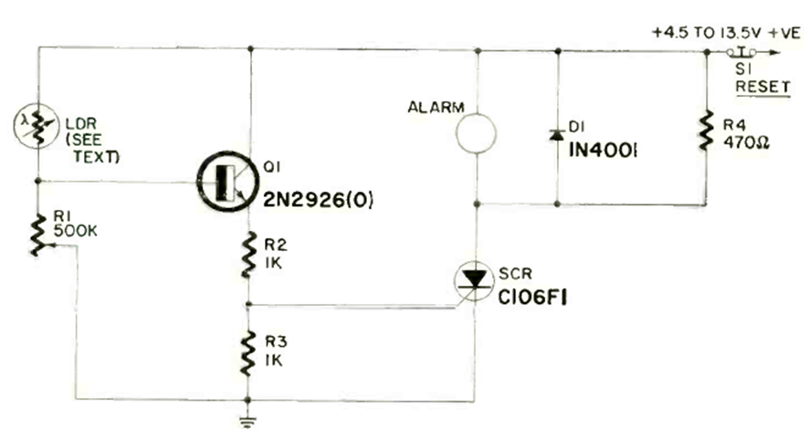 Este circuito se encontró en la revista Radio Electronics de agosto de 1971. El SCR admite equivalentes y se puede utilizar un relé sensible en lugar del zumbador.