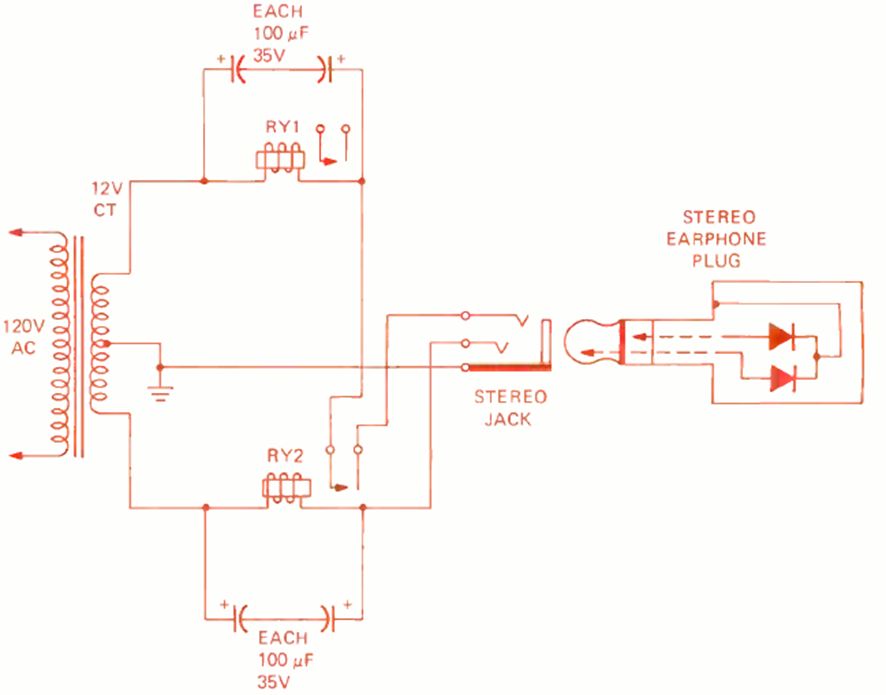 Este circuito se encontró en la revista Radio Electronics de mayo de 1972. El código de activación de los dos relés viene dado por la posición de los dos diodos en el enchufe acoplado a un conector estéreo. Los relés tienen voltaje según el transformador utilizado.