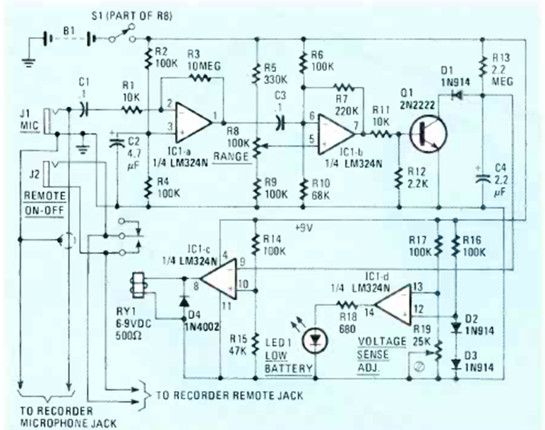 Este circuito fue publicado en Radio Electronics en noviembre de 1983. Es un accesorio que sirve para controlar las grabaciones para que la grabadora entre en acción sólo cuando hay sonido. El circuito utiliza componentes que todavía son comunes en la actualidad.