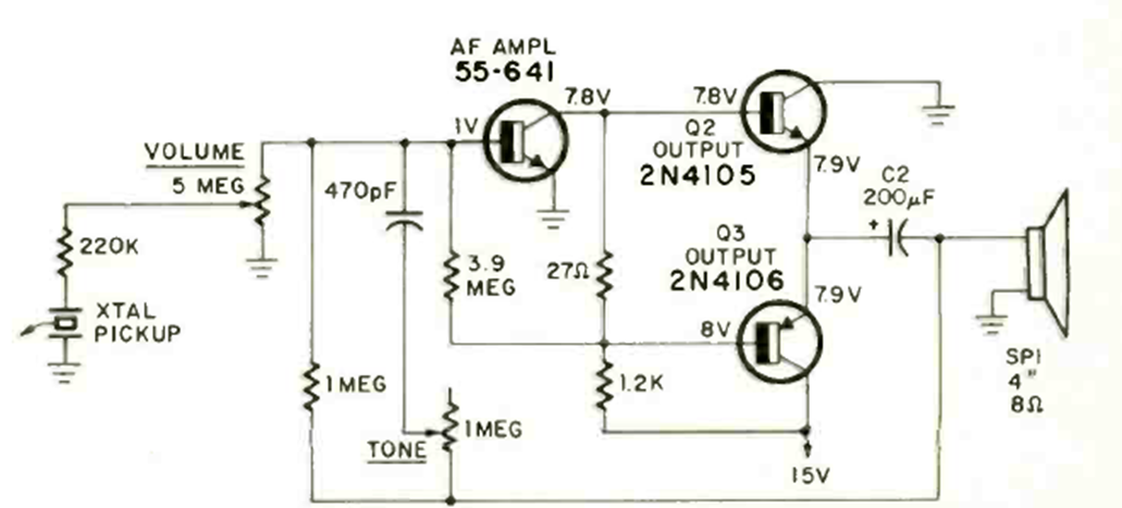 Este amplificador con par de acoplamiento directo fue publicado en la revista Radio Electronics en febrero de 1971. El circuito tiene una potencia de unos pocos watts y está recomendado para tocadiscos pequeños.