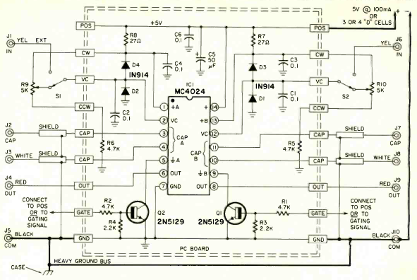 Este circuito TTL es de una revista de Radio Electronics de febrero de 1973. El circuito debe alimentarse con 5 V y la frecuencia máxima depende del TTL integrado.