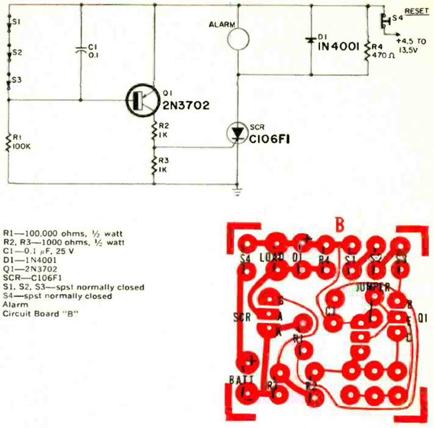 Utilizando un SCR serie 106, este circuito se encontró en la revista Radio Electronics de mayo de 1971. La corriente de reposo es muy baja y viene dada por el valor de R1.