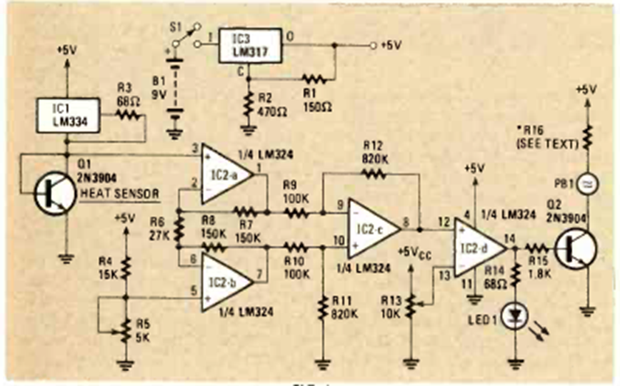 El propósito de este detector de calor es encontrar puntos calientes en un plato u otros lugares. El sensor es uno integrado de la época. El circuito es de una Radio Electronics de mayo de 1985.