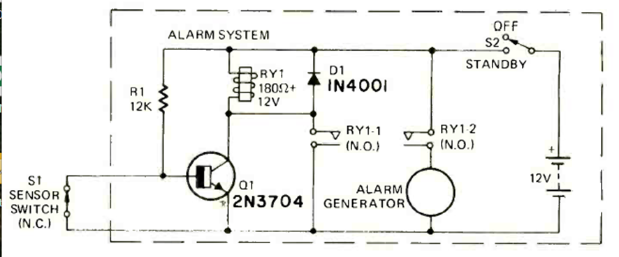 Este circuito utiliza un transistor para activar la alarma desde un sensor de baja corriente de reposo. El relé es de 12 V. El circuito es de la revista Radio Electronics de abril de 1975.