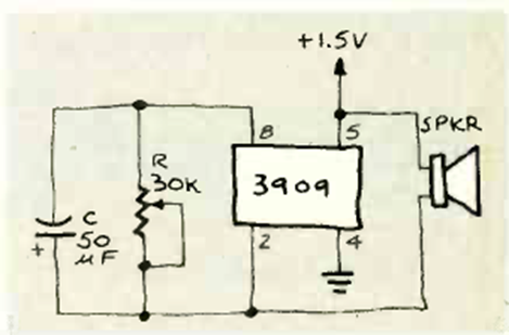 Este oscilador que apareció en la revista Radio Electronics de abril de 1984 es adecuado para llamar pájaros. El ajuste de frecuencia se realiza en el trimpot y la alimentación proviene de una sola batería.