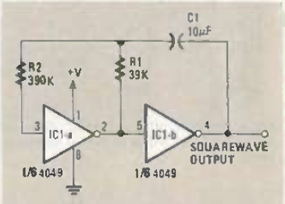 Este circuito apareció en Radio Electronics en noviembre de 1984. La frecuencia depende básicamente de C1. La señal generada es rectangular.