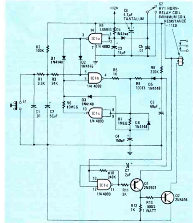 Este circuito fue sugerido por la revista Radio Electronics de septiembre de 1983 en la sección de nuevas ideas. Los componentes son comunes y los transistores admiten equivalentes.