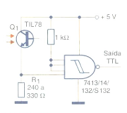 El circuito que se muestra en la figura activa directamente una puerta lógica TTL, por lo que requiere un suministro de 5 V. El resistor R1 determina la sensibilidad del circuito. El nivel de salida lógico depende de si se corta la luz del sensor o incide sobre él, recordando que el puerto TTL actúa como inversor. Se pueden utilizar otras funciones de activación del inversor (Schmitt) en la misma configuración.
