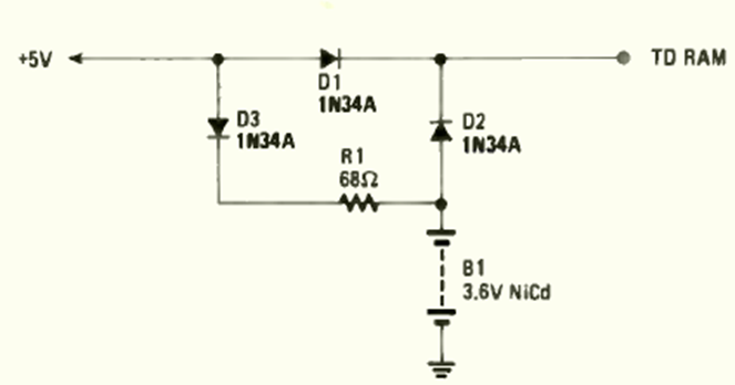 Este circuito es de una revista de Radio Electronics de agosto de 1984. Monitorea el estado de una batería de respaldo de RAM. La resistencia R1 determina la carga de la batería.