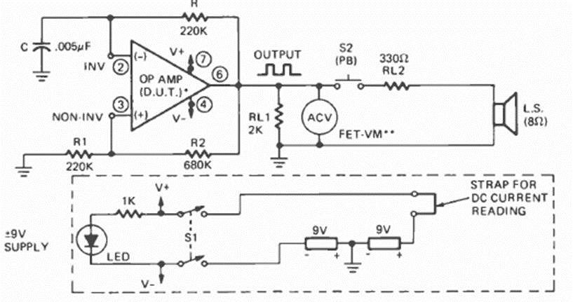 Este circuito fue encontrado en la revista Radio Electronics de septiembre de 1974. Consiste en un oscilador simple que se utiliza para probar amplificadores operacionales. Genera una señal de audio si el funcionamiento es bueno.