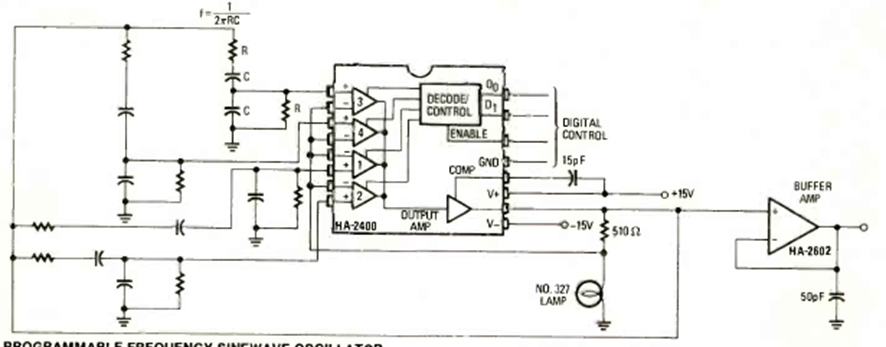 Este circuito se encontró en la revista Radio Electronics de marzo de 1980. Está basado en el IC HA2400 que debe ser alimentado por una fuente simétrica. La frecuencia máxima es de 10 MHz dependiendo de los componentes de la red externa.