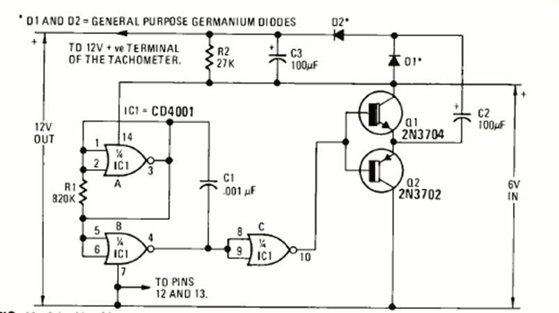 Este circuito conmutado se encontró en la revista Radio Electronics de abril de 1976. El circuito tiene baja corriente y se recomienda para aplicaciones digitales de 6 V.