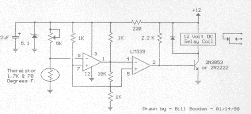 Encontramos este circuito en documentación de los años 90. El circuito activa el relé a la temperatura marcada por el potenciómetro. Cambiando el sensor se pueden compensar sus características cambiando este potenciómetro.