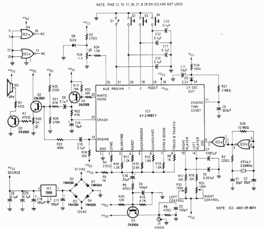 Este es el circuito tradicional del videojuego de carreras de 1980 con el AY3-6603-1 que también publicamos en su momento en nuestras revistas. Este circuito es de la revista Radio Electronics de agosto de 1980.