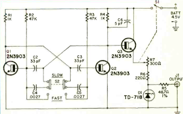Este pequeño generador de inyector de señal se encontró en la revista Radio Electronics de febrero de 1971. El circuito utiliza transistores de propósito general en ese momento y se puede implementar con equivalentes actuales.