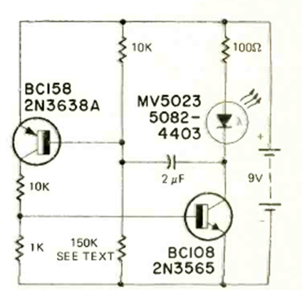 Este circuito de fuente de corriente constante para LED es de una revista de Radio Electronics de noviembre de 1972. Los transistores son generalmente versiones más antiguas de BC558 y BC548. La corriente es de 2 mA.