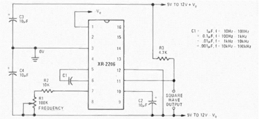 Encontramos este circuito en la revista Radio Electronics de abril de 1977. El circuito genera señales cuadradas en el rango de frecuencia que depende de C1. Los valores se dan al lado del diagrama.
