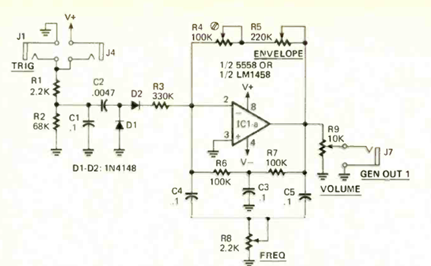 Este circuito, que forma parte de un instrumento de percusión, fue encontrado en la revista Radio Electronics de septiembre de 1979. El amplificador operacional puede ser el 5556, equivalente al 741 o incluso al 741. La fuente debe ser simétrica.
