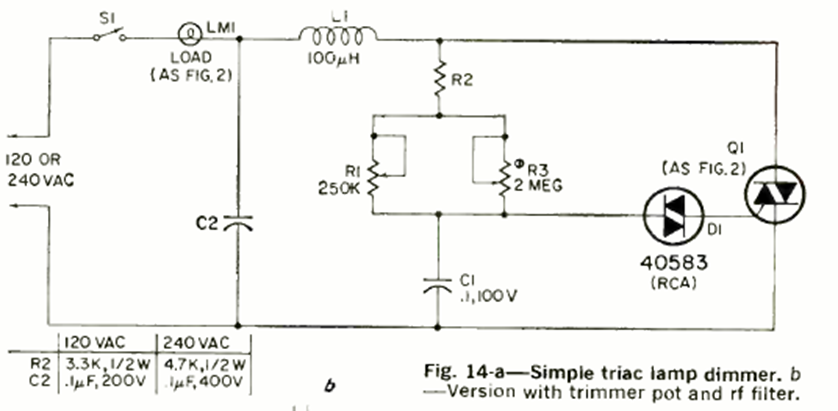Otro circuito de atenuación. Este atenuador para lámparas incandescentes se encontró en la revista Radio Electronics de julio de 1970. El triac debe estar equipado con un disipador de calor y su corriente debe controlarse según la carga.