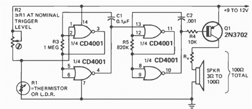 Este circuito se encontró en la revista Radio Electronics de enero de 1975. El circuito está basado en el 4001 y tiene un paso de potencia que se puede cambiar según sugerencias de circuitos anteriores de esta serie 4001.