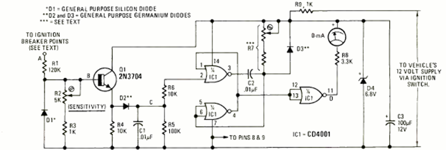 La indicación de velocidad de este circuito se realiza en un instrumento analógico. El circuito se utiliza para contar pulsos (rpm) y se encontró en la revista Radio Electronics de abril de 1976.