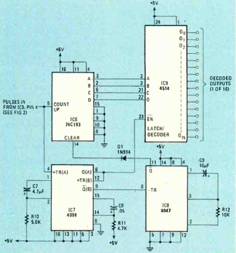 Para trabajar con los circuitos anteriores, este decodificador proporciona una salida1 de 10. El circuito es de una Radio Electrónica de agosto de 1984. Ver los circuitos anteriores.