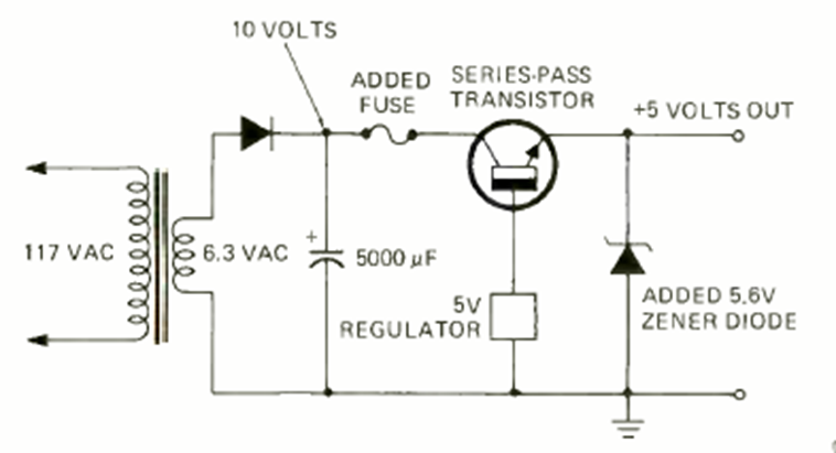 Este circuito tiene como objetivo forzar una corriente mayor que la del fusible en el transistor en caso de problemas, quemándolo como protección. Lo encontramos en una revista de Radio Electronics de octubre de 1972.