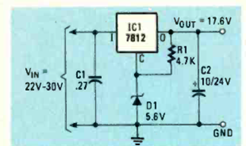En la figura tenemos una manera de aumentar el voltaje de salida de un 7812 con un diodo zener. Se pueden utilizar otros integrados de la serie. El circuito es de una Radio Electronics de julio de 1984.