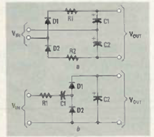 En la figura tenemos dos configuraciones simples de duplicador de voltaje. Las resistencias y diodos se seleccionan según las tensiones y corrientes deseados.