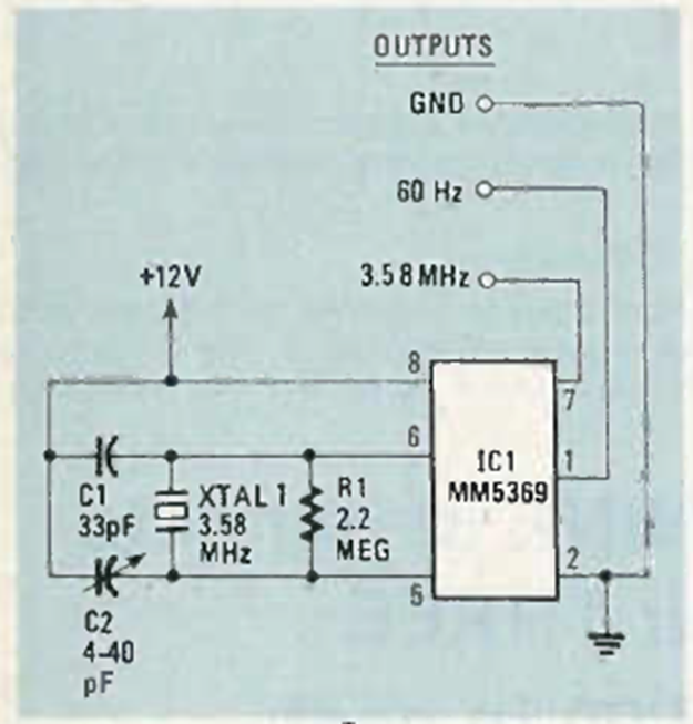 La figura muestra cómo generar una señal de reloj de 60 Hz para circuitos TTL. El circuito es de una Radio Electronics de junio de 1985. El cristal es de 3,58 MHz.