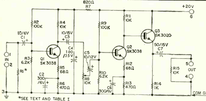 Este circuito es de Radio Electronics de octubre de 1970. El circuito utiliza transistores de período y tiene una salida de baja impedancia. La resistencia de R1 depende de la impedancia de la señal de entrada.