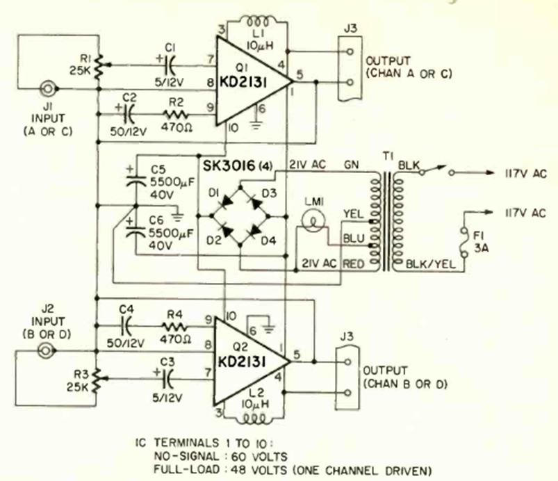 Esta es la mitad de un amplificador de 4 canales de un sistema publicado en la revista Radio Electronics de octubre de 1971. El amplificador utiliza un módulo híbrido de época. Su potencia es de 50 W por canal, lo que suma 200 W para el sistema. La distorsión es inferior al 1%. El transformador [es de 42V x 1 A.