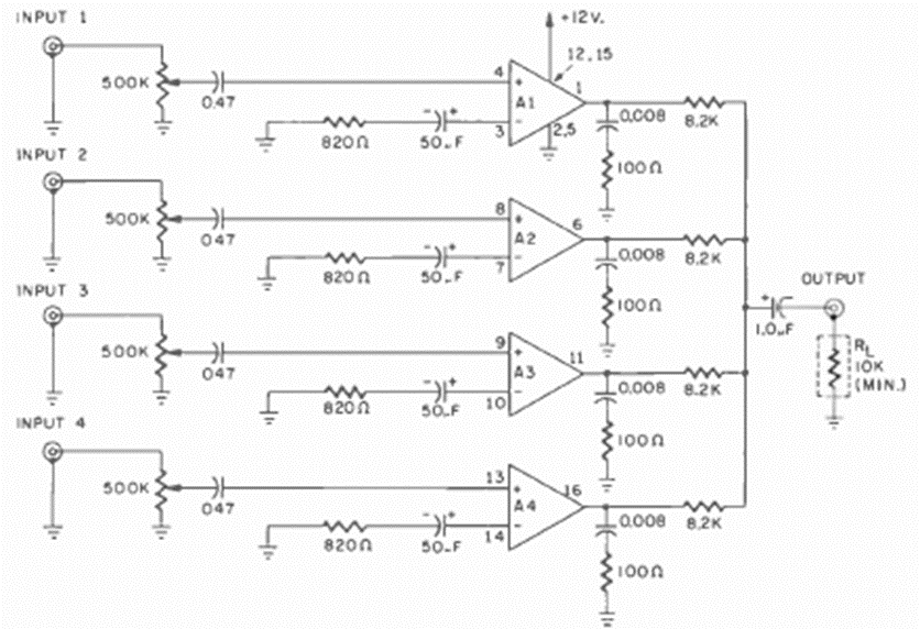 Este mezclador con ganancia de 20 dB por canal utiliza circuitos integrados CA3048 de RCA. Lo encontramos en la revista Radio Electronics de julio de 1971. La alimentación no tiene por qué ser simétrica.