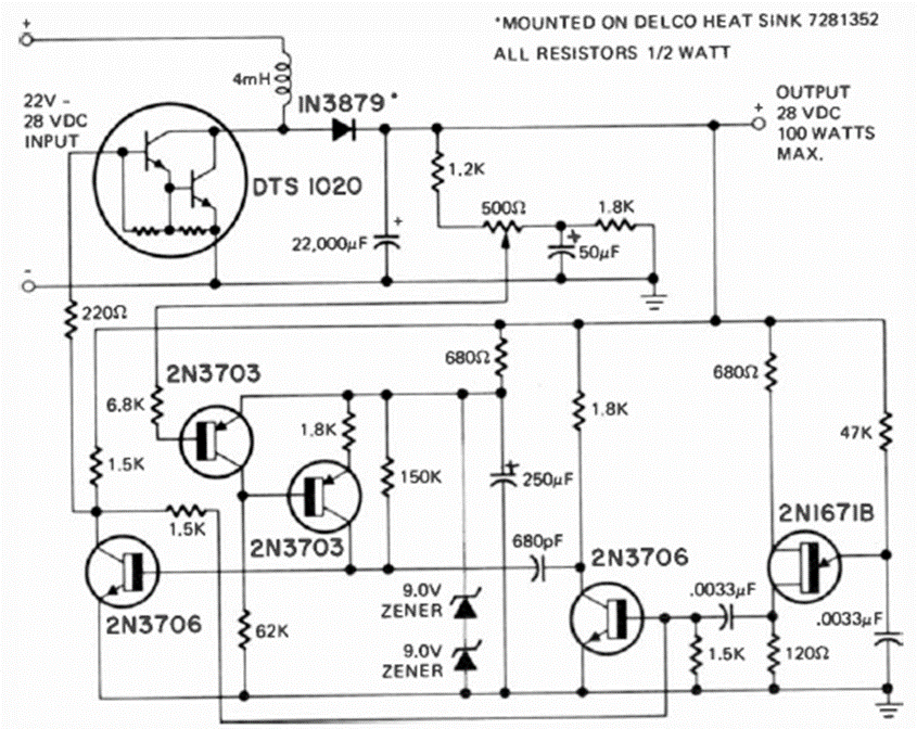 Este circuito fue encontrado en la revista Radio Electronics de agosto de 1973. El transistor Darlington es un tipo de alta potencia de la época. Este transistor debe estar equipado con un disipador de calor.