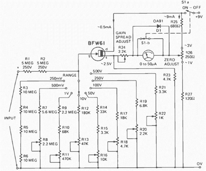 Este bonito circuito con indicador analógico fue encontrado en la revista Radio Electronics de enero de 1974. El circuito tiene 8 escalas con ajustes individuales. El instrumento es de 50 uA.