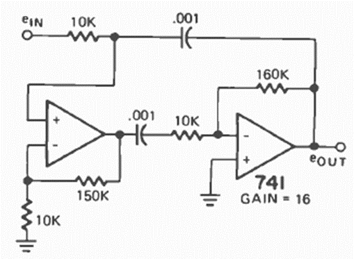 Este filtro con el 741 tiene un factor Q de 8 a una frecuencia de 1 kHz. El circuito es de una Radio Electrónica de noviembre de 1973. El operacional es el 741 o equivalente.