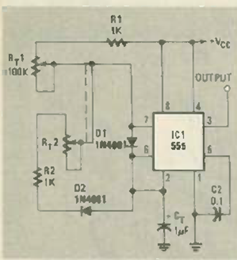 Con este circuito es posible variar la frecuencia de un 555 manteniendo constante el ciclo activo. El circuito es de una revista Radio Electronics de julio de 1985.