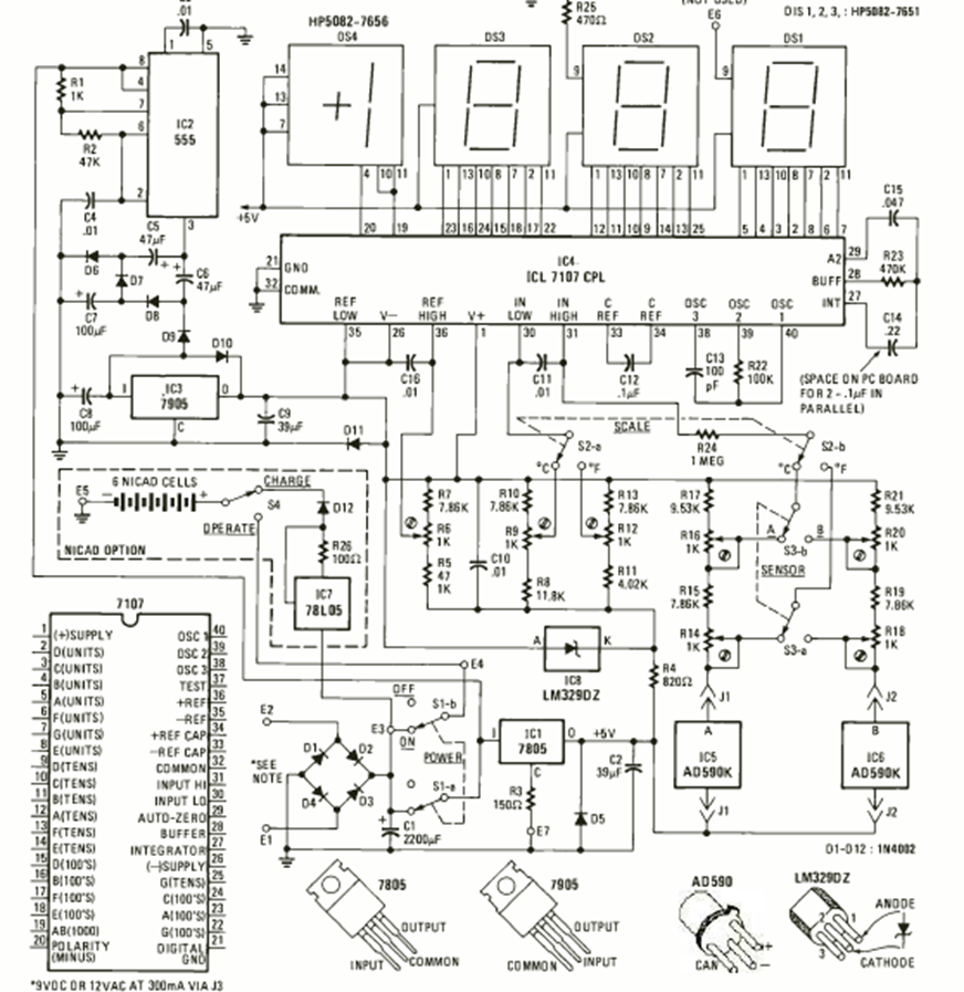 Este circuito es de una revista de Radio Electronics del 79 de julio. Hace uso del conocido IC 7107, un excitador de cristal líquido que se hizo popular en circuitos de este tipo en su momento.