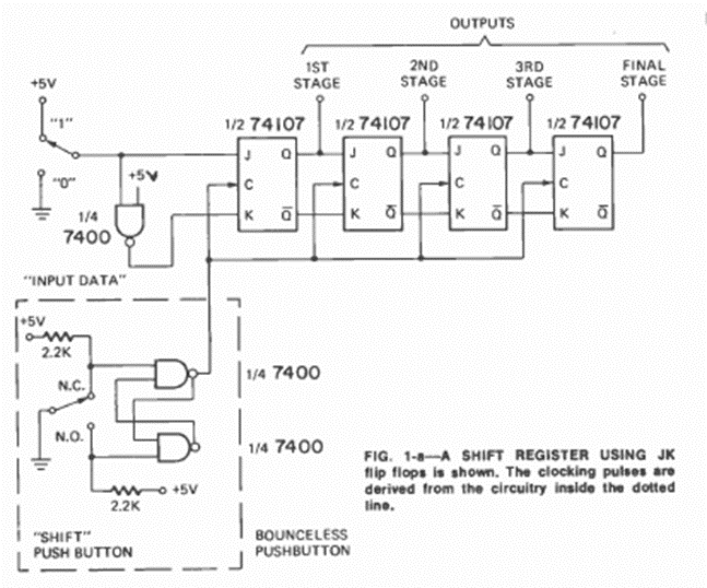 Encontrado en un artículo de la revista Radio Electronics de diciembre de 1974, este circuito tiene propósitos educativos y puede usarse para enseñar cómo funciona un registro de desplazamiento (shift register). A las salidas se pueden conectar LED.