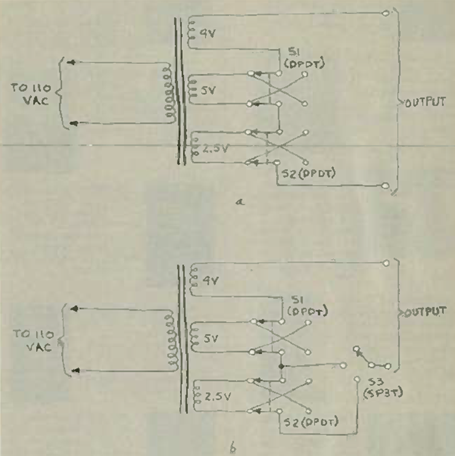 En la figura vemos cómo utilizar un transformador de 3 devanados para conmutar salidas con diferentes tensiones sumando los voltajes de los devanados. El circuito se puede modificar para usarlo con transformadores con más devanados.